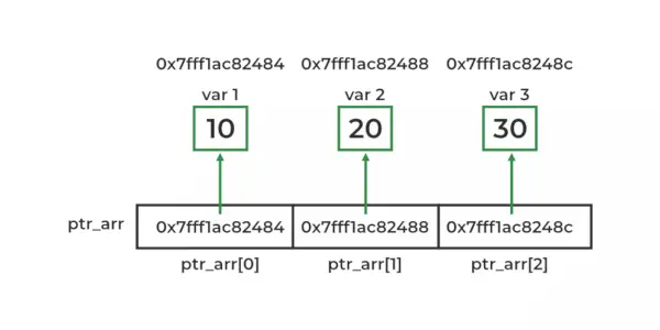 // C program to demonstrate the use of array of pointers> #include> int> main()> {> > // declaring some temp variables> > int> var1 = 10;> > int> var2 = 20;> > int> var3 = 30;> > // array of pointers to integers> > int> * ptr_arr[3] = { &var1, &var2, &var3 };> > // traversing using loop> > for> (> int> i = 0; i <3; i++) {> > printf> (> 'Value of var%d: %d Address: %p
