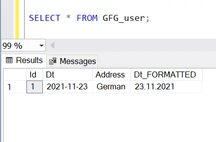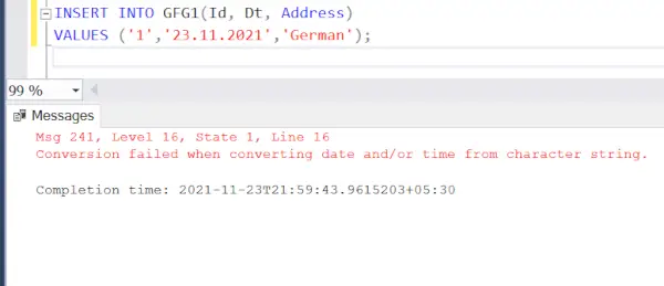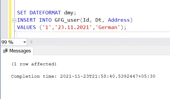 SET DATEFORMAT dmy; INSERT INTO GFG_user (Id, Dt, Address) VALUES ('1','23.11.2021', 'German');>