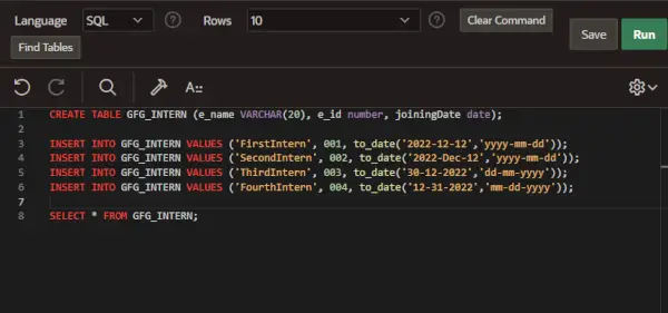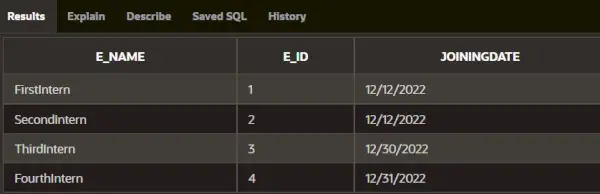 CREATE TABLE GFG_INTERN (e_name VARCHAR(20), e_id number, joiningDate date); INSERT INTO GFG_INTERN VALUES ('FirstIntern', 001, to_date('2022-12-12','yyyy-mm-dd')); INSERT INTO GFG_INTERN VALUES ('SecondIntern', 002, to_date('2022-Dec-12','yyyy-mm-dd')); INSERT INTO GFG_INTERN VALUES ('ThirdIntern', 003, to_date('30-12-2022','dd-mm-yyyy')); INSERT INTO GFG_INTERN VALUES ('FourthIntern', 004, to_date('12-31-2022','mm-dd-yyyy')); SELECT * FROM GFG_INTERN;>