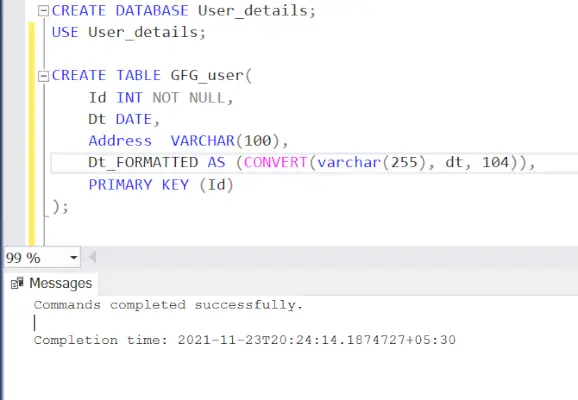 CREATE TABLE GFG_user(Id INT NOT NULL,Dt DATE, Address VARCHAR(100),Dt_FORMATTED AS (convert(varchar(255), dt, 104)), PRIMARY KEY (Id) );>