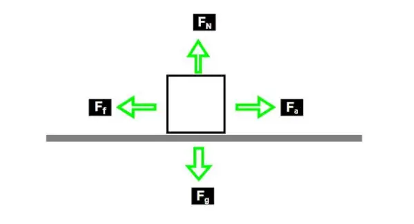 Lorsqu'une force est appliquée à l'objet, non seulement la force appliquée agit, mais il existe de nombreuses autres forces comme la force gravitationnelle, la force de friction et la force normale qui équilibre la force opposée. Par conséquent, la force nette est représentée par :