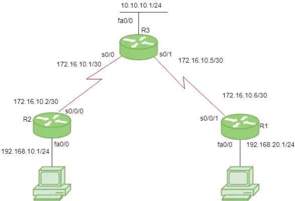 Considérez la topologie donnée ci-dessus qui comporte 3 routeurs R1, R2, R3. R1 a l'adresse IP 172.16.10.6/30 sur s0/0/1, 192.168.20.1/24 sur fa0/0. R2 a l'adresse IP 172.16.10.2/30 sur s0/0/0, 192.168.10.1/24 sur fa0/0. R3 a l'adresse IP 172.16.10.5/30 sur s0/1, 172.16.10.1/30 sur s0/0, 10.10.10.1/24 sur fa0/0.