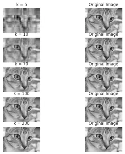 # Imports> from> skimage.color> import> rgb2gray> from> skimage> import> data> import> matplotlib.pyplot as plt> import> numpy as np> from> scipy.linalg> import> svd> '''> Singular Value Decomposition> '''> # define a matrix> X> => np.array([[> 3> ,> 3> ,> 2> ], [> 2> ,> 3> ,> -> 2> ]])> print> (X)> # perform SVD> U, singular, V_transpose> => svd(X)> # print different components> print> (> 'U: '> , U)> print> (> 'Singular array'> , singular)> print> (> 'V^{T}'> , V_transpose)> '''> Calculate Pseudo inverse> '''> # inverse of singular matrix is just the reciprocal of each element> singular_inv> => 1.0> /> singular> # create m x n matrix of zeroes and put singular values in it> s_inv> => np.zeros(X.shape)> s_inv[> 0> ][> 0> ]> => singular_inv[> 0> ]> s_inv[> 1> ][> 1> ]> => singular_inv[> 1> ]> # calculate pseudoinverse> M> => np.dot(np.dot(V_transpose.T, s_inv.T), U.T)> print> (M)> '''> SVD on image compression> '''> cat> => data.chelsea()> plt.imshow(cat)> # convert to grayscale> gray_cat> => rgb2gray(cat)> # calculate the SVD and plot the image> U, S, V_T> => svd(gray_cat, full_matrices> => False> )> S> => np.diag(S)> fig, ax> => plt.subplots(> 5> ,> 2> , figsize> => (> 8> ,> 20> ))> curr_fig> => 0> for> r> in> [> 5> ,> 10> ,> 70> ,> 100> ,> 200> ]:> > cat_approx> => U[:, :r] @ S[> 0> :r, :r] @ V_T[:r, :]> > ax[curr_fig][> 0> ].imshow(cat_approx, cmap> => 'gray'> )> > ax[curr_fig][> 0> ].set_title(> 'k = '> +> str> (r))> > ax[curr_fig,> 0> ].axis(> 'off'> )> > ax[curr_fig][> 1> ].set_title(> 'Original Image'> )> > ax[curr_fig][> 1> ].imshow(gray_cat, cmap> => 'gray'> )> > ax[curr_fig,> 1> ].axis(> 'off'> )> > curr_fig> +> => 1> plt.show()> |